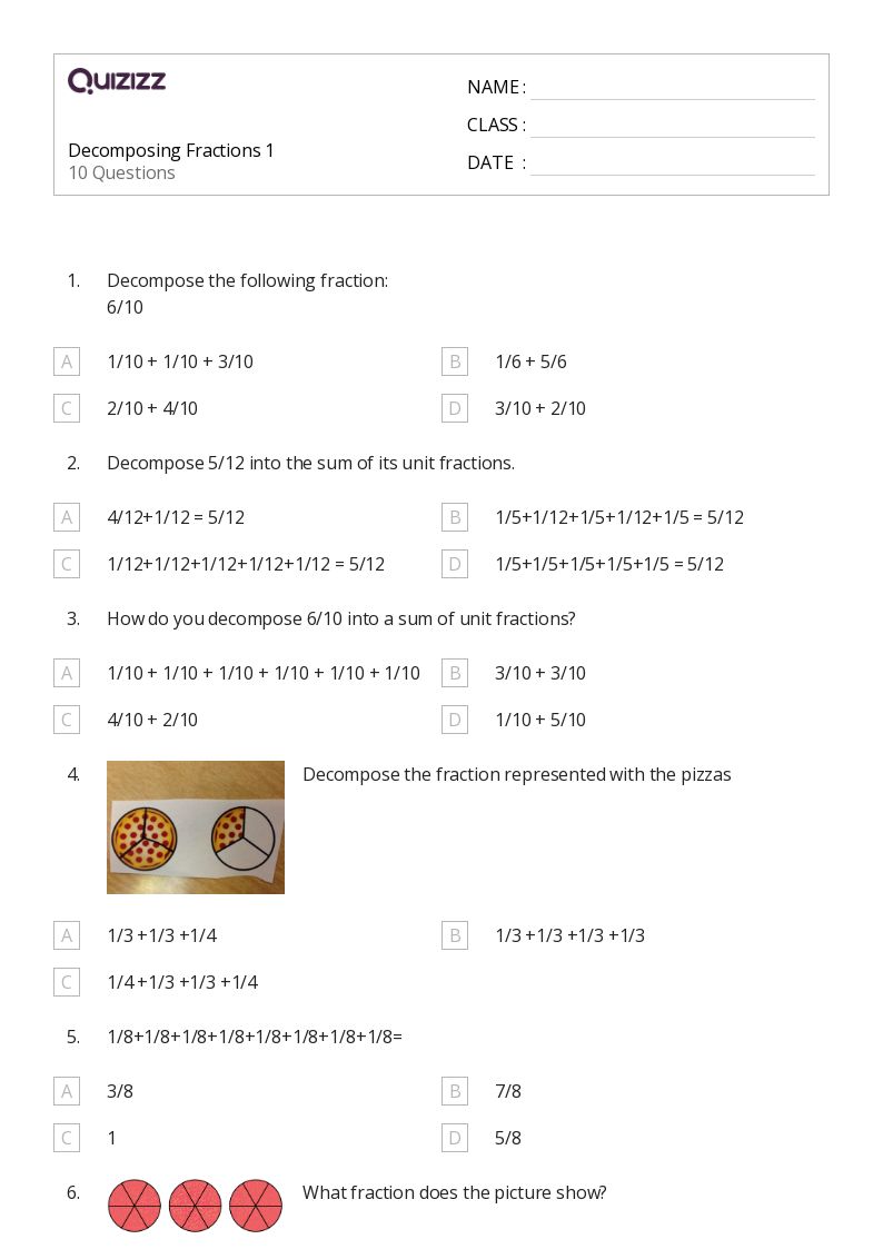 This is a worksheet the allows students to practice decomposing fractions and identifying their models. Quizzes and a final fractions assessment 6. Showing 8 worksheets for decomposing fractions. The worksheets contains various problems including shading fractions to model decomposing, multiple choice, computation and number stories.